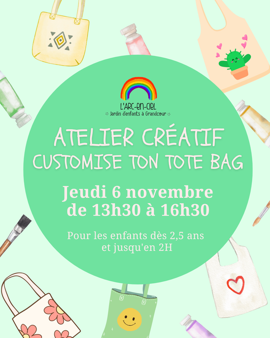 L'Arc-en-Ciel organise des ateliers thématiques pour les enfants de 2,5 à 6 ans (ou jusqu'à la fin de la 2H). Les ateliers sont diversifiés. Ils peuvent être en intérieur, dans les locaux de l'Arc-en-Ciel ou en extérieur comme par exemple à la forêt, au canapé forestier de Grandcour. De la cuisine, des découvertes en forêt, des bricolages, des visites à la ferme... Et plein d'autres surprises attendent les enfants.